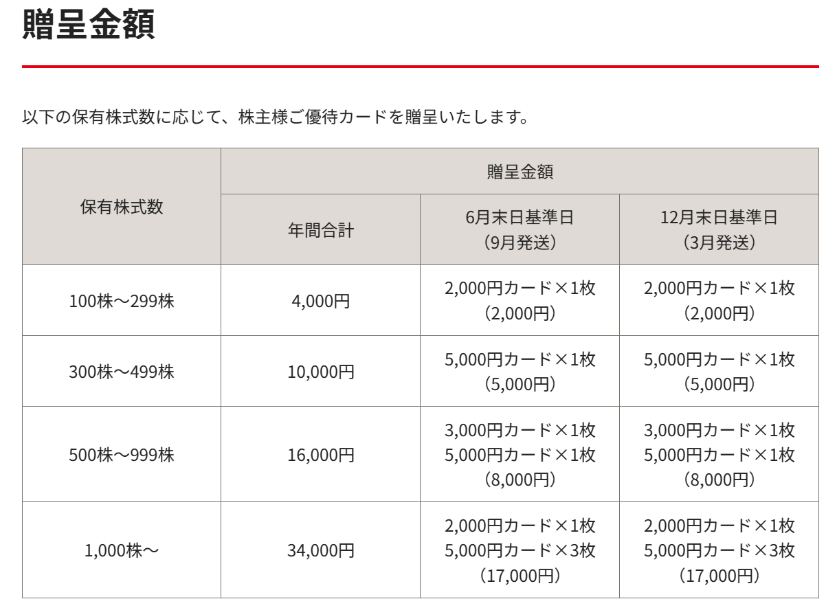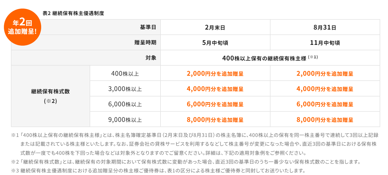 また、以下の様に200株、400株と優待金額も増えていっていますので、資金に余裕のある人は100株以上をもってみてもよいのではないでしょうか(株価自体もそこまで高くありませんしね(‘◇’)ゞ)