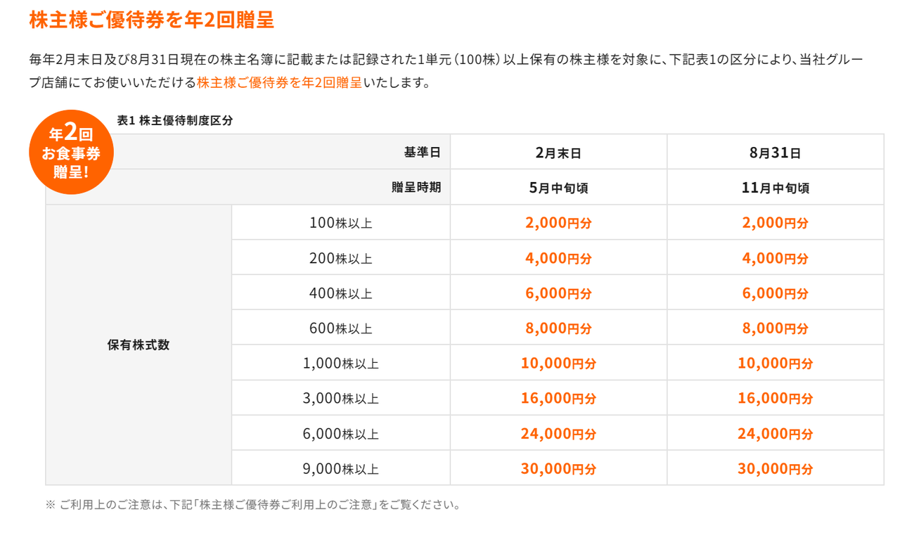 もらえる株主優待は、すかいらーくグループで使える優待カードです。100株で4,000円分、300株で10,000円分です。我が家は夫婦で300株ずつ持ってるので、年間20,000円分の優待がもらえます(#^^#)